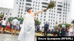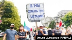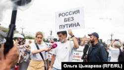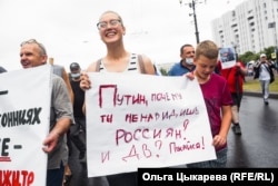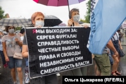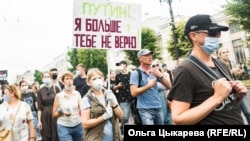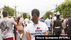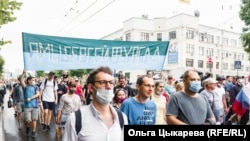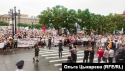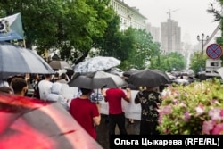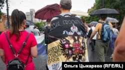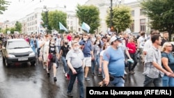 В Хабаровске прошла очередная массовая протестная акция – четвертую субботу подряд. На сей раз под сильным ливнем. Участников шествия и митинга не испугал ни дождь, ни прошедшие накануне задержания активистов Ростислава Буряка, Валентина Квашенникова и блогера Алексея Романова. Теперь протестующие к прежним лозунгам добавили новый – "Свободу политзаключенным". Побывала на акции и корреспондент Сибирь.Реалии.